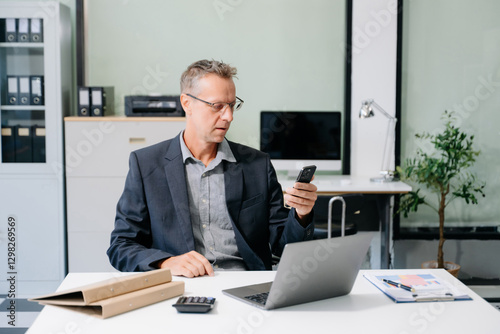 Professional businessman working at office with laptop, tablet, and notes. Perfect for business, finance, accounting