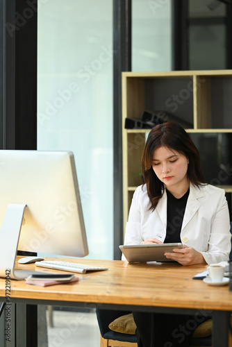 Professional businesswoman analyzing sales statistics data on her digital tablet