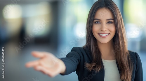 businesswoman, handshake, professional, smiling, friendly, welcoming, corporate, leadership, entrepreneur, collaboration, teamwork, office, success, brunette, confident, career, manager, networking, executive, partnership, meeting, approachable, business, client, workspace, interaction, support, modern, job, casual attire, formal, positive, agreements, fashionable, motivation, opportunity, workplace, invitation, cheerful