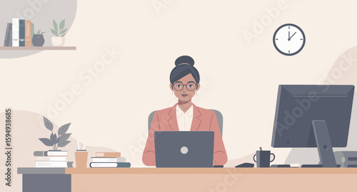 businesswoman, professional, office, workplace, laptop, computer, desk, work, employee, career, business, modern, contemporary, technology, woman, female, confident, successful, elegant, stylish, illustration, graphic, design, vector, marketing, corporate, manager, executive, entrepreneur