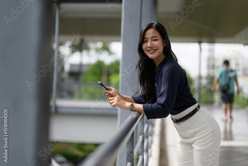 businesswoman, smartphone, city, business, woman, asian, young, modern, technology, communication, railing, leaning, using, smiling, urban, professional, work, lifestyle, mobile, device, connectivity, cyberspace, online, happy, confident, successful, elegant, stylish, office, men at work, employee, career, architecture, building, outdoors, daytime, sky, tree, background, people, female, adult, portrait, 1, person