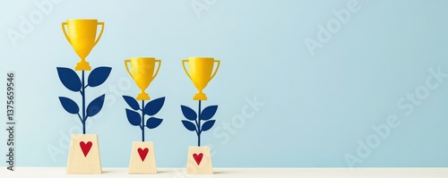 Professional Change promotion concept. Trophies with plants symbolize growth and achievement.