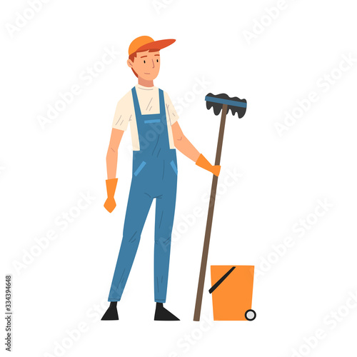 Professional Cleaning Man Standing with Mop and Bucket, Male Worker Character Dressed in Blue Overalls and Rubber Gloves, Cleaning Company Staff Vector Illustration
