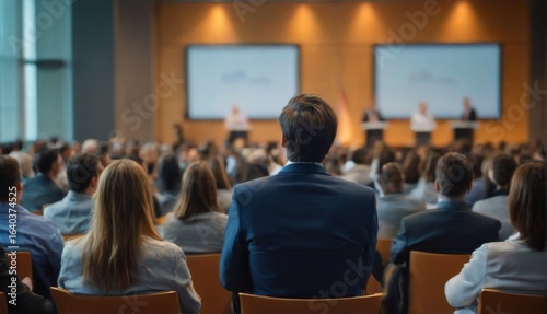 conference, room, people, chair, stage, ceiling, lighting, window, screen, presentation, audience, business, attire, suit, casual attire, professional, focused, large, group, row, sitting, listening, formal, image, sense, high, display