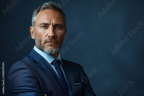 Professional Confident Man in Suit with Gray Hair, Serious Expression, Against a Dark Background for Business, Leadership, or Corporate Conceptual Imagery