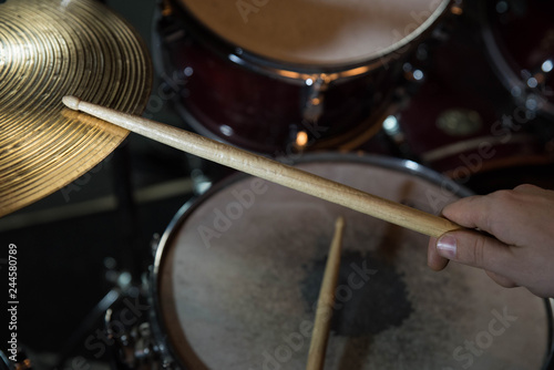 Professional drum set closeup. Drummer with drumsticks playing drums and cymbals, on the live music rock concert or in recording studio