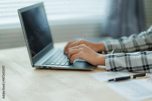 Professional female accountant reviewing annual expense reports at her desk with a laptop and paperwork — ideal for finance, tax, and corporate business themes.