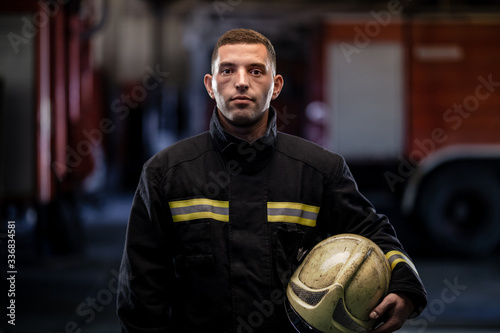Professional fireman portrait. Firefighter wearing uniform and protective helmet. Fire truck in the background.