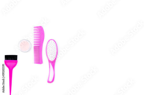 Professional hairdressing tools in beauty saloon. Combs, brushes on white background top view copy space