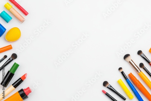 Professional makeup artist's tools and decorative cosmetics arranged on a colorful background.