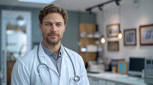 doctor, medical office, health care, male, white coat, stethoscope, smiling, professional, modern, office, medicine, health, wellness, consulting room, clinic, physician, medical professional, trust, caring, exam, lighting, cleanliness, service, diagnosis, professionalism, warmth, expertise, comfort, treatment, doctor's appointment, staff, safety, compassion, well-being, support, smile, generative, ai