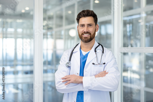 doctor, physician, health care, medicine, medicals, professional, man, male, portrait, confident, trustworthy, expert, specialist, hospital, clinic, practitioner, health, healthy, staff, uniform, laboratory, coat, stethoscope, arm, crossed, smiling, beard, standing, indoor, modern, well, being, treatment, care, service, young, adult, intern, resident, general, consulting, assistance, helping, prevention, exam, diagnostic, consultation, people, person, occupation