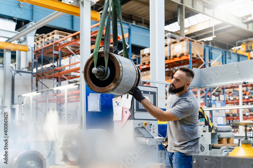 Professional male engineer analyzing steel machine part at industry