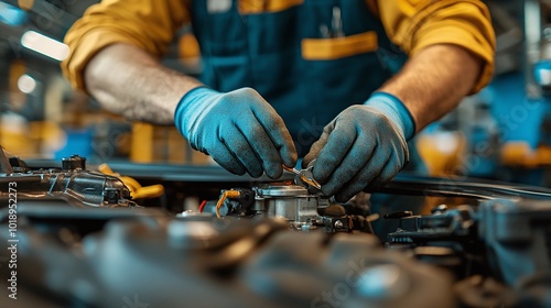 professional mechanic wearing gloves working under the hood of a vehicle in an auto repair shop, focusing on car maintenance, engine repair, and the use of specialized mechanic tools