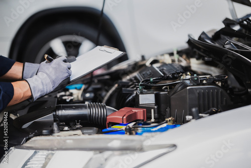 Professional mechanic working on the engine of the car in the garage. Car repair service.