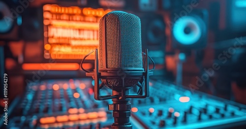 Professional Microphone in Dimly Lit Recording Studio with Audio Mixer and Musician Background