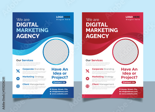 flier, template, design, agency, business, promotion, advertising, campaign, corporate, branding, service, contact, address, website, electronic mail, creative, shape, red, blue, modern, professional, leaflet, booklet, presentation, poster, layout, graphic, vector, illustration, company, offer, solution, idea, project, communication, information, marketing, management