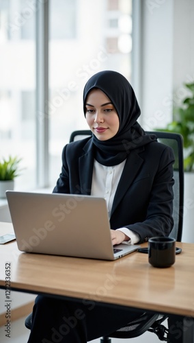 woman, professional, muslim, office, laptop, concentration, business, indoor, plant, workspace, working, sharpened, technology, corporate, productivity, smartphone, manager, adult, modern, businesswoman, sitting, female, executive, career, digital, activity, teamwork, documentation, communication, environment, strategic, planning, approach, thinking, idea, introspection, innovative, solution, multitask, information