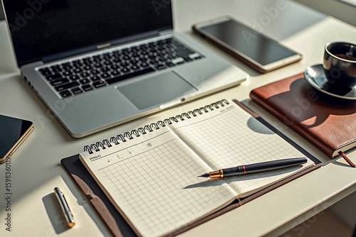 Professional office desk still life with a notebook, pen, and laptop, ideal for business and finance work