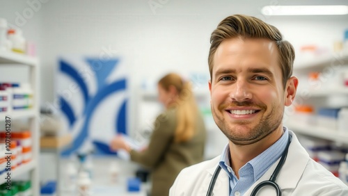Professional Pharmacist in Blue Pharmacy Smiling with Stethoscope, Ideal for Healthcare Advertising and Medical Marketing Materials
