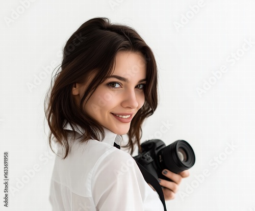 photographer, professional, portrait, torso, holding, camera, equipment, smiling, warm, friendly, confident, looking, shoulder, glance, side, angle, view, studio, white, background, isolated, lighting, clean, crisp, sharp, detail, polished, modern, expression, sharpened, concentrated, technique, skill, readiness, creative, lens, grip, hand, posture, attire, formal, casual attire, young, adult, human, person, occupation, career