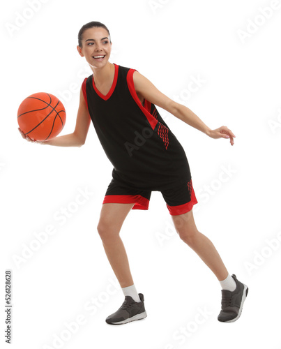 adult, white, isolated, background, person, game, caucasian, sport, sportive, player, basketball, professional, uniform, ball, woman, female, young, throwing, happy, smiling, leisure, lifestyle, action, strength, basket, shot, studio, fitness, exercise, training, team, success, activity, athlete, competition, succeed, physical, full, length, playing, sportswoman, healthy, strong, wearing, fit, physical exercise, sport, black, short