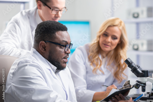 Professional team of scientists is working on a vaccine in a modern scientific research laboratory. Genetic engineer workplace. Future technology and science.