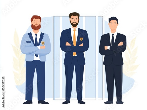 Professional team of three businessmen in modern suits standing confidently in a corporate setting, symbolizing leadership, collaboration, and success in business environments