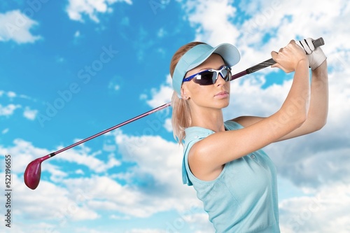 Professional woman golfer teeing golf in golf tournament competition at golf course for winner concept.