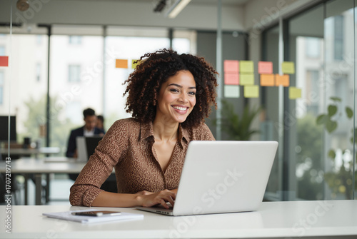Professional Woman with Laptop and Notebook - Smiling Office Worker at Desk for Virtual Communication, Video Calls, Remote Interpreting, and International Day of the Deaf Awareness