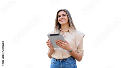 businesswoman, business, people, woman, person, businessperson, entrepreneur, finance, tablet, cyberspace, online, app, economy, success, corporate, manager, ceo, working, leader, company, young, mid-age, boss, female, online shopping, happy, smile, diversity, femininity, portrait, confidence, equality, well-being, adult, lifestyle, beautiful, cheerful, mexican, hispanic, latin, caucasian, spanish, joy, positive, technology, transparent, isolated, background