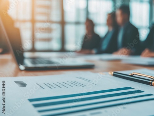 Professional workspace with documents, laptop, and pens showcasing a productive meeting environment illuminated by natural light and blurred figures in the background.