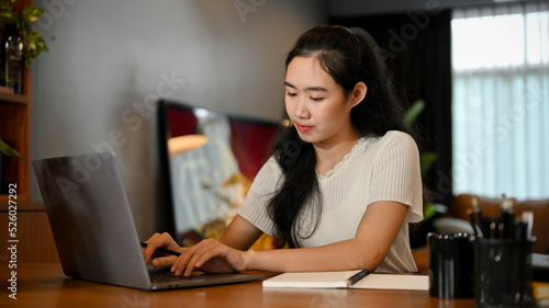 Professional young Asian businesswoman working from home and sending an email on a laptop