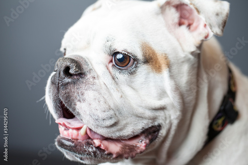 bulldog, dog, profile, smiling, brown, white, teeth, portrait