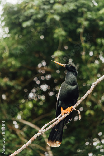 Profile of a tropical black bird sitting on a branch in the amazon forest