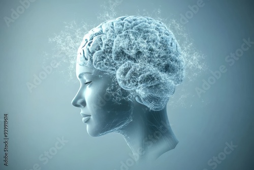 Profile of a Woman with a Brain in Icy Blue Tones Representing the Cool Precision of Thought Mental Focus and the Clarity of a Sharp Analytical Mind