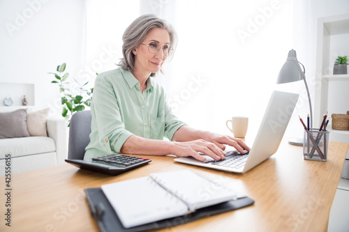 Profile photo of charming person sit behind desk look use laptop typing email working from home indoors