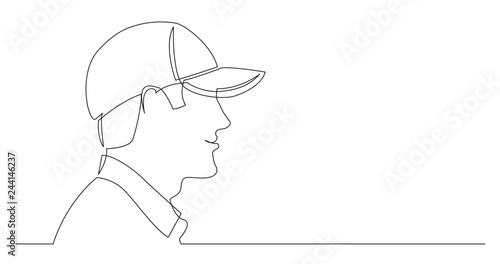profile portrait of smiling man in baseball cap - continuous line drawing on white background