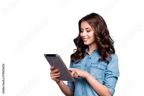 Profile side view of nice cute intelligent cheerful delicate winsome lovely magnificent girl with wavy hair in casual denim shirt, typing in digital portable computer, isolated over grey background