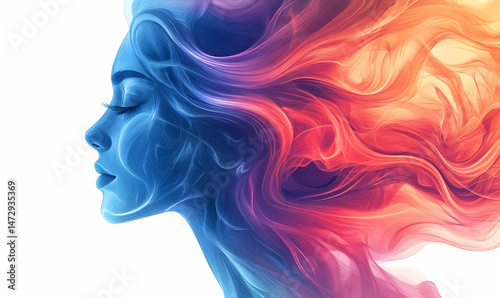 profile, face, woman, portrait, hair, abstract, colourful, blue, orange, red, art, digital, graphic, illustration, design, style, beauty, concept, creative, visual, flowing, dynamic, energy, movement, silhouette, artwork, background, isolated, copy space, modern, texture, composition, light, shape, emotion, dream, fantasy, imagination, freedom, thought, expression, symbol, vapour, smoke, element, surreal, elegant