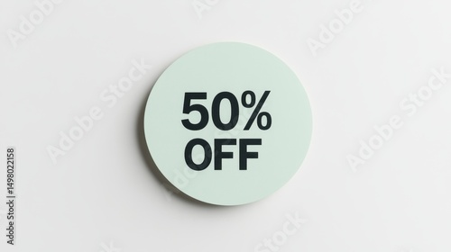 Promotional discount announcement flatlay shot light green circular note minimalist background top-down view 50% off offer