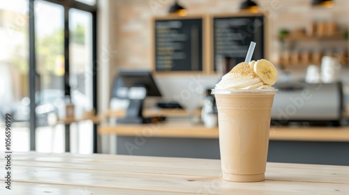 Protein Power Smoothie with protein powder and banana in a fitness-themed glass, copy space