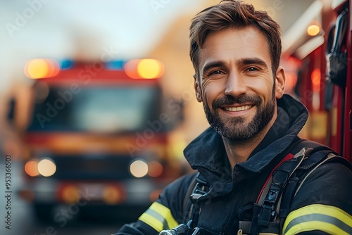 Proud Firefighter Smiling with Firetruck on Solid White Background