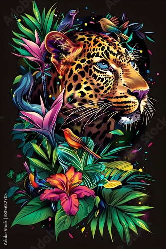 leopard, rainforest, foliage, canopy, predator, stealth, agility, lush, colourful, bird, branch, tree, solid, black, background, bright, colours, logotype, detailed, jungle, nature, wildlife, felino, big cat, fauna, tropical, flora, vibrant, high-coloured, dynamic, stylised, digital, render, optical, mascot, branding