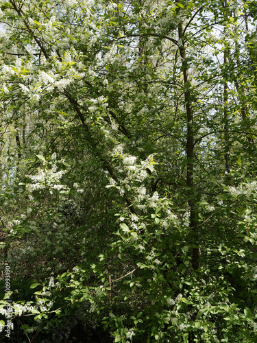 Prunus padus | Small ornamental European Bird cherry multi-stem tree. Dull grey-brown branches and twigs covered with white flowers in racemes and dark green oval leaves with serrated edge