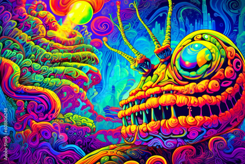 hallucinogen, bug, insect, creature, disturbed, monster, horror, creepy, fantasy, terror, scarey, bad, high, painting, groovy, hallucinogenic, acid, trip, drug, retro, 1960s, stylised, surreal, lsd, art, artwork, colourful, colourful, flower child, neon, bright, high-coloured, digital, vibrant, concept, rock, album, cover, design, mushroom, illustration