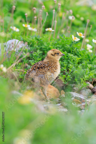 japan, early summer, july, national park, plateau, ptarmigan, chick, wild bird, cute, rock, telephoto, morning, beautiful, green, brown, white, breeze, cool
