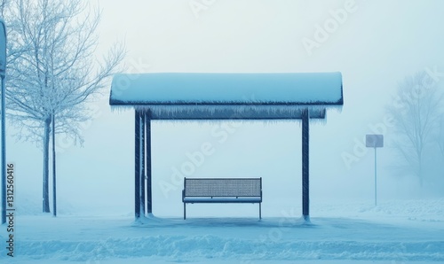 public bus stop covered in snow, showcasing freeze warning atmosphere. scene evokes sense of solitude and winter chill, with minimalistic design elements