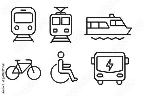icon, transport, public, vector, set, line, linear, outline, symbol, pictogram, transportation, subway, subway, train, tram, streetcar, ferry, boat, ship, bicycle, bike, wheelchair, accessible, disability, access, bus, electric, eco, sustainable, green, travel, urban, city, mobility, signs, graphic, illustration, element, collection, simple, minimal, infographic