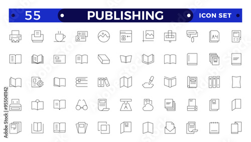 Publishing Outline icon. Flyer Brochure line icon set. letterhead, booklet, leaflet, corporate catalog, envelope.